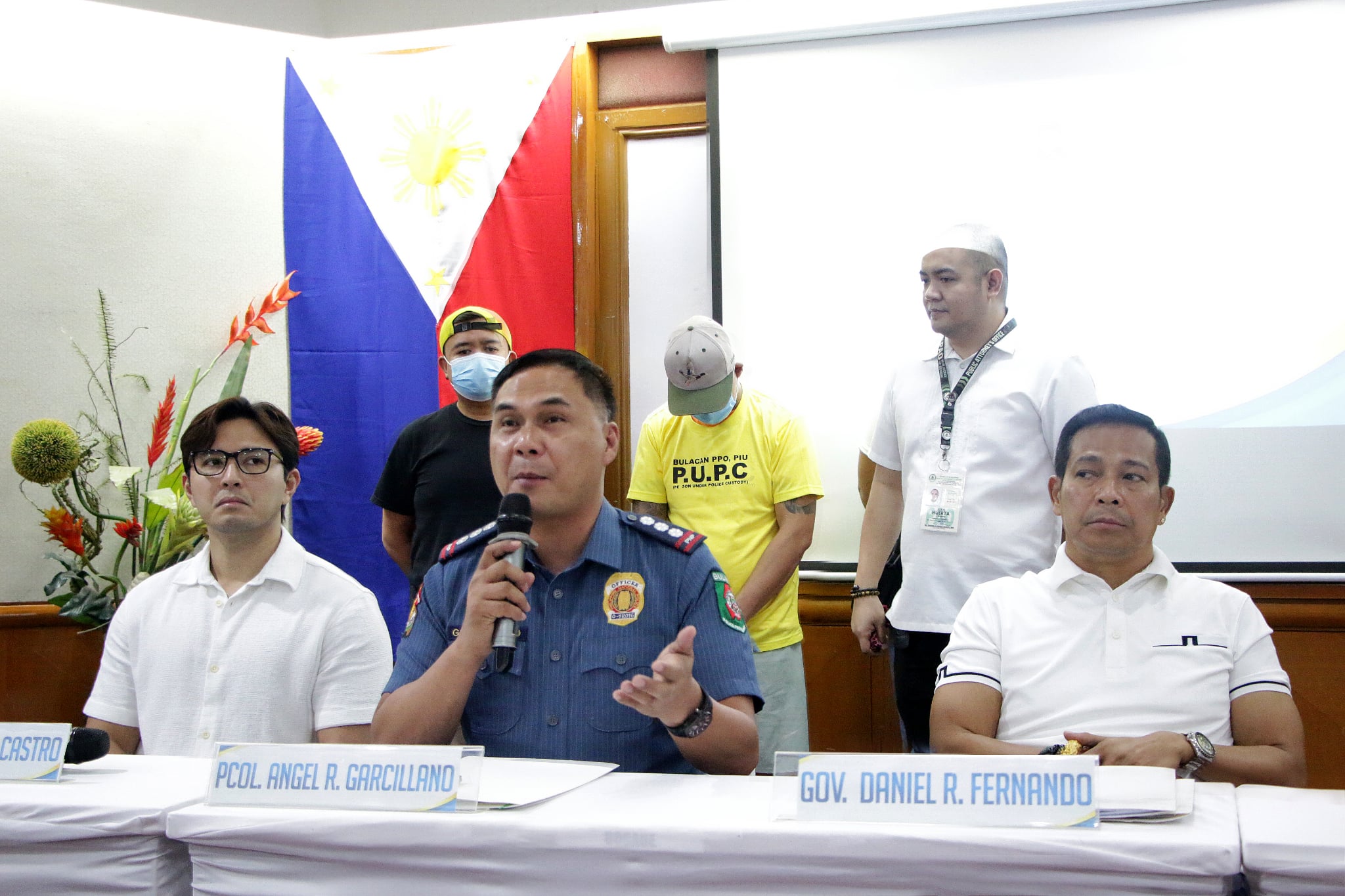 ARRESTED MURDER SUSPECT. Governor Daniel R. Fernando, Bulacan Police Provincial Office Provincial Director PCol. Angel L. Garcillano, and Vice Gov. Alexis C. Castro present Christian Roxas alyas “Lupin”, one of the suspects on the murder case of former Association of Barangay Captains-Bulacan President Ramilito Capistrano and Shedrick Toribio to the media, in a press conference held at Balagtas Hall, Hiyas ng Bulacan Convention Center, City of Malolos, Bulacan today. Also in the photo is Atty. Juris Huerta of the Public Attorney’s Office.